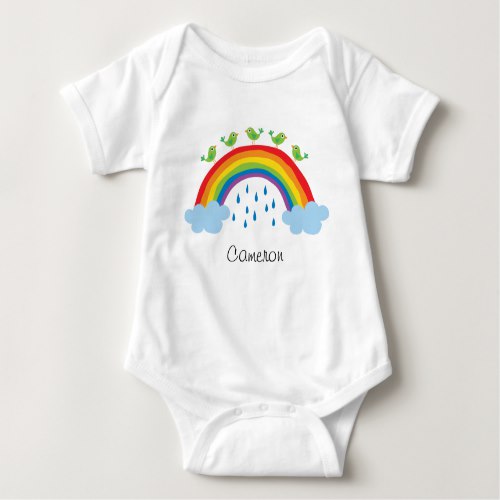 Personalized name baby one-piece featuring a cute cartoon illustration of green birds standing on a rainbow. A colourful and fun design for a little baby boy or girl. Would make a cute baby shower gift