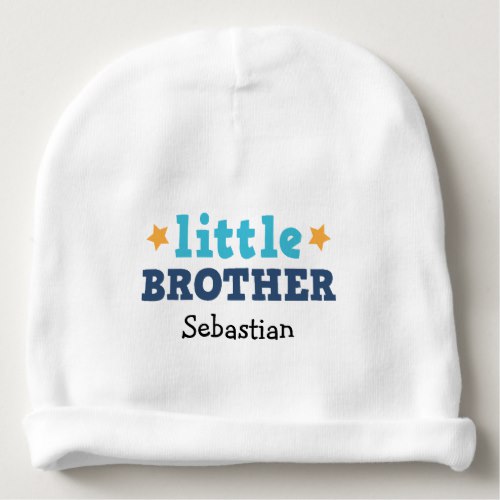 Cute, custom baby beanie with blue text "little brother" and yellow stars. Customizable name. Fun design for little brothers. Would make a cute baby shower gift.