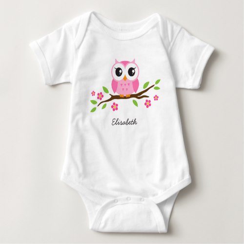 Cute baby romper featuring a little pink cartoon owl sitting on a branch with green leaves and hot pink flowers. Fun design with personalized name for kids.