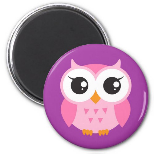Round fridge magnet or locker magnet featuring a cute illustration of a little pink cartoon baby owl on a purple background. Fun design for girls.