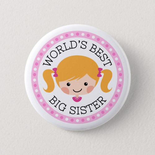 Cute pinback button / pin featuring a little cartoon girl with blond hair tied up in pigtails with pink bows. Text "World’s best big sister". Around is a round, pink border with polka dots. Also available in a version for little sisters.