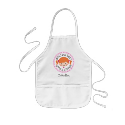 Cute, personalized apron featuring a little cartoon girl with red hair tied up in pigtails with pink bows. Text "World’s best little sister". Around is a round, pink border with polka dots. Also available in a version for big sisters.